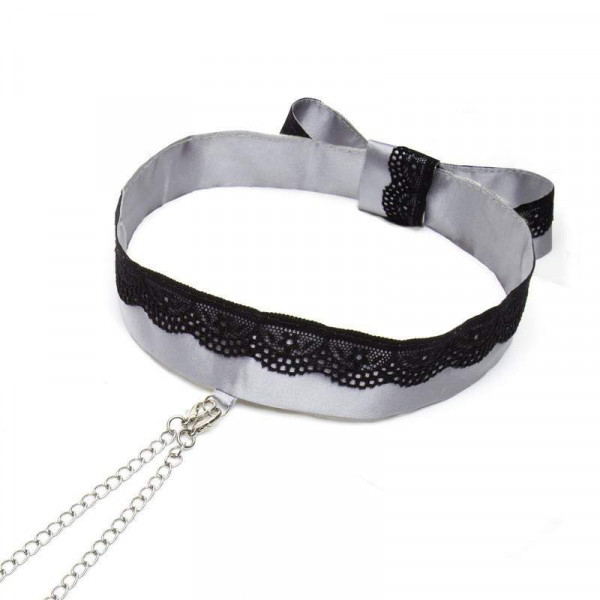 Роскошный ошейник выполнен из серого атласного материала и декорирован нежнейшим черным кружевом. Ошейник не имеет замка, его можно завязать на узел либо на бант. Металлическое D-образное кольцо позволяет крепить к ошейнику различные девайсы